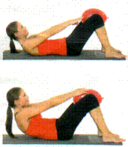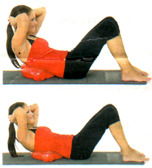 Strafft den Bauch, eine Basisübung. In Rückenlage Füße auf den Boden stellen und Ballon hinter dem Rücken zwischen den Schulterblättern positionieren. Die Handflächen hinter den Kopf legen, die Ellbogen zeigen dabei nach außen. Gehen Sie nun zuerst mit dem Oberkörper leicht nach vorne. Nun starten Sie mit kurzen kleinen Bewegungen nach vorn und wieder zurück. Halten Sieden Rücken immer leicht rund und atmen Sie beim Vorbeugen aus. Kopf lockerlassen! Halten Sie immer Kontakt mit dem Ballon. Diese Basisübung für die Bauchmuskeln hat es in sich: Üben Sie nur solange. wie Sie können! Wechseln Sie öfters die Frequenz: 8Mal langsam, dann 8Mal schnell. 4Mal langsam, 4Mal schnell ... |