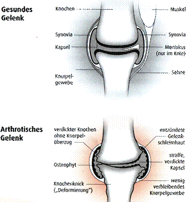 Arthrose ist eine Erkrankung des Knorpelgewebes in den Gelenken, der über die Jahre ein langsamer verlaufender Prozess ist. Durch ihren Knorpelüberzug können die Knochen mit nur minimaler Reibung übereinander gleiten. Die Enden der beiden Knochen, welche in einem Gelenk aufeinander treffen, sind mit einem natürlichen Stoßdämpfer überzogen, dem Knorpelgewebe. Gemeinsam mit der Gelenkschmiere ermöglicht der Knorpel ein fast reibungsloses Gleiten der Gelenkflächen aneinander. Die Gelenkflüssigkeit „schmiert“ das Gelenk, unterstützt die Ernährung des Knorpelgewebes, hält dieses glatt und die Knorpeloberfläche rutschig. Die Gelenke werden zusätzlich noch durch Muskulatur zusammen gehalten. Die Muskeln wiederum sind über Sehnen an den Knochen befestigt. Kommt es in einem Gelenk zur Arthrose, raut sich das Knorpelgewebe nach und nach auf und der darunter liegende Knochen wird mit der Zeit mehr und mehr zerstört. Die Folgen sind Entzündungen, Schmerzen und Bewegungseinschränkungen besonders am Morgen. Leider ist Arthrose nicht heilbar. Schmerzen und Behinderung können auf vielfache Weise gelindert werden. Eine therapeutische Maßnahme lässt mit Hilfe von knorpelaufbauenden Substanzen (Chondroprotektiva) das Fortschreiten der Erkrankung verlangsamen. Dazu zählt Glicosamin. Es ist eine natürliche, im Körper vorkommende Substanz (Knorpelbestandteil, Gelenkflüssigkeit) ist. Dieser Wirkstoff wird aus Schalentieren gewonnen und führt nachweislich zur Regeneration der Gelenksknorpel.