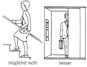 Gehen: Unebenes Gelände sowie Steigungen sollen vermieden werden. Wo vorhanden, sollte anstelle von Treppen der Aufzug benützt werden. Zur Entlastung des betroffenen Kniegelenkes ist eine Handstockbenutzung auf der gesunden Gegenseite sinnvoll. Können Steigungen und Treppenaufgänge nicht vermieden werden, so lassen Sie sich Zeit, stützen Sie sich am Treppengeländer ab und nehmen Sie Stufe für Stufe. Steigen Sie mit dem Fuß des besseren Knies nach oben und heben das Problemknie nach. |