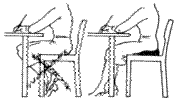 Sitzen: Die Sitzhöhe muss der Unterschenkellänge angepasst werden. Beim Sitzen sollten Knie- und Hüftgelenke unter rechtwinkeliger Beugung des Kniegelenkes auf gleicher Höhe stehen. Eine Dauerbeugestellung des Kniegelenkes ist ungünstig, da sie einen erhöhten Druck auf das Kniescheibengleitlager ausübt. Zur Entlastung können die Kniegelenke beim Sitzen ausgestreckt werden, ggf. müsste die Sitzhöhe durch einen Sitzkeil angehoben werden. |