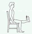 Im Sitz: Setzen Sie sich auf einen Stuhl oder eine Bank, keine Rollstühle · Fußhochziehen und Knie strecken · Oberschenkel etwas abheben · Im Wechsel Fußinnenrand bzw. –außenrand hochziehen · Wiederholung 5* je Seite, gesamte Übung 5* |