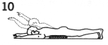 9. Bauchlage: Die Arme liegen in U-Form neben dem Kopf. Grundspannung aufbauen, gleichzeitig beide Arme abheben und die Schulterblätter Richtung Wirbelsäule zusammenschieben. Übungserweiterung: Mit den Armen Schwimmbewegungen ausführen. Ziel: Kräftigung der gesamten Rückenmuskulatur, Dehnung der Brustmuskulatur. |