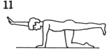 11. Vierfüßler Stand: Auf beiden Händen (Ellbogen leicht gebeugt) und Knie stützen – Rücken dabei gerade halten durch Anspannen der Bauch- und Gesäßmuskulatur. Wechselseitig jeweils ein Bein nach hinten wegstrecken, die Zehen heranziehen und dabei den Kopf wieder nach vorne herausschieben(Bein nicht höher als bis zur Waagrechten) Übungserweiterung: Linkes Bein nach hinten strecken – dabei den rechten Arm nach vorne nehmen und umgekehrt.. Wenn die Bewegung korrekt ausgeführt wird, bilden Bein, Kopf und Arm eine gerade Linie. Ziel: Kräftigung der Gesäß- und Rückenmuskulatur, Schulung des Gleichgewichtes. |