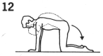 12. Vierfüßler Stand: Bauch einziehen, Kopf auf die Brust nehmen und den Rücken nach oben ziehen („Katzenbuckel“), dabei ausatmen. Kopf anschließend in den Nacken nehmen und die WS behutsam nach unten drücken („Pferderücken“), hierbei einatmen Übungserweiterung: Mit maximaler Rundrückenhaltung („Katzenbuckel“) das Gesäß zu den Fersen führen. Ziel: Mobilisierung der WS, Dehenung und Kräftigung der Rumpfmuskulatur. |
