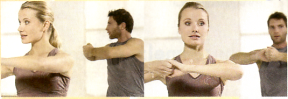 OBERKÖRPER DREHEN Die Drehbewegung hält die Brustwirbelsäule beweglich. Gleichzeitig stärken Sie die Muskeln im oberen Rücken. Stehen Sie mit leicht geöffneten Beinen. Spannen Sie Po und Bauch fest an - achten Sie auf eine aufrechte Haltung. Legen Sie nun ihre Hände vor dem Körper ineinander, und halten Sie die Ellenbogen waagrecht. Drehen Sie den Oberkörper. soweit es geht, zu einer Seite. Halten Sie die weiteste Position für einen