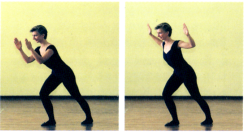 Fit 7 Programmausklang. Gestrecktes Bein, Vorfuß zum Schienbein ziehen. Gleichzeitig umkreisen die Unterarme einander. Danach andere Seite.